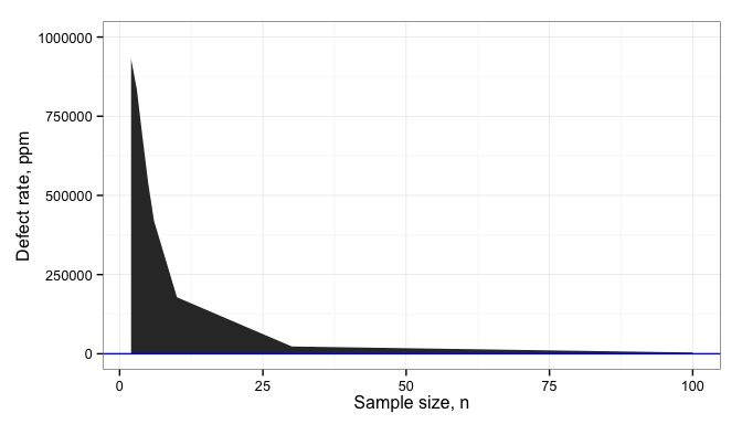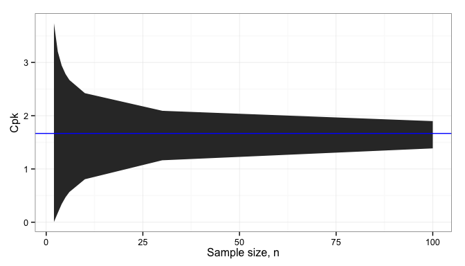 mean that we have uncertainty in what the true process Cpk (or defect rates) will be once we’re in production. When our sample testing tells us that the Cpk should be 1.67 (the blue line), the true process Cpk will actually turn out to be somewhere in the shaded band: