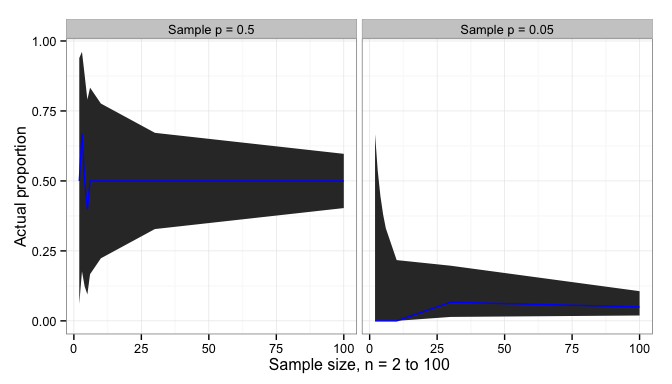 For proportions, the situation is similar: there is a 95% chance that the true sample proportion, , is within the shaded band based on the measured sample proportion