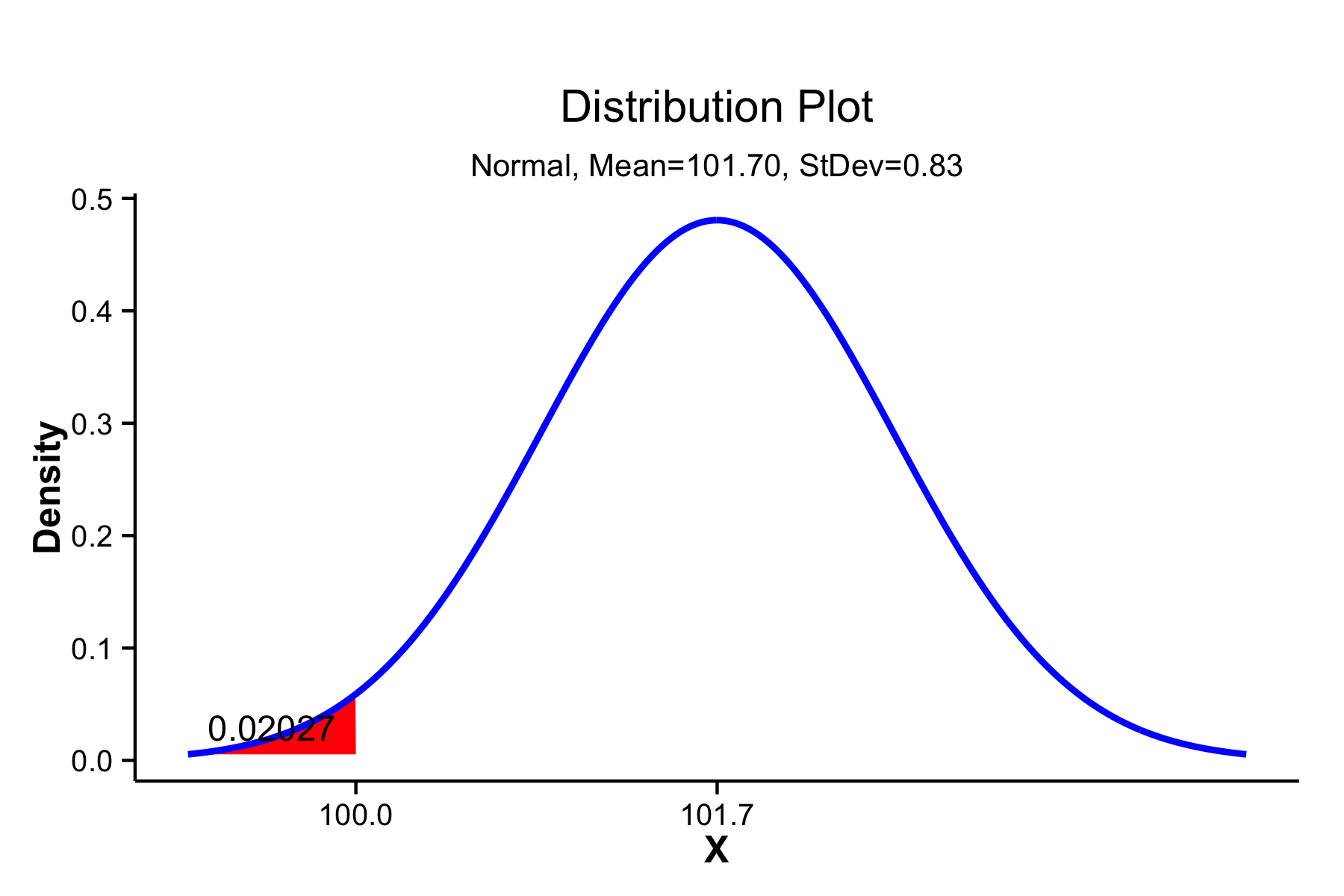 Minitab can also display this graphically. Open the “Graph” menu, select “Probability Distribution Plot…” Select “View Probability” (the right-most option) and click “OK,” On the “Distribution” tab, select “Normal” from the distribution menu and enter “101.7” for the mean and “0.83” for the standard deviation. Then switch to the “Shaded Area” tab, select “X Value,” “Left Tail” and enter “100” for the “X value.” Click on “OK” to obtain a plot like that below.