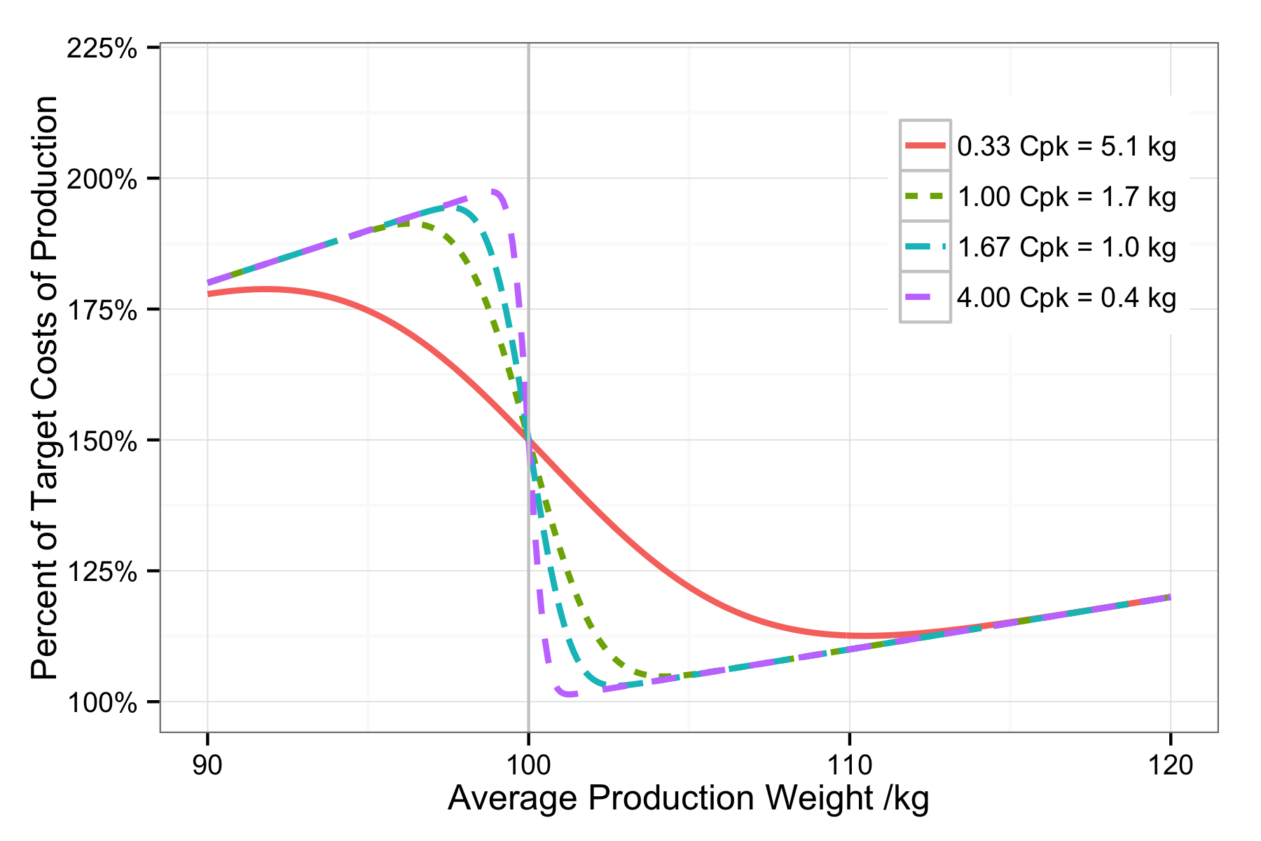 Percent of target production costs given an average production weight and four different process capabilities.